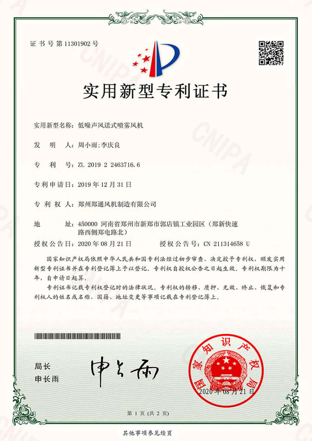 實(shí)用新型專利證書1低噪聲風(fēng)送式噴霧風(fēng)機(jī)實(shí)用新型專利證書
